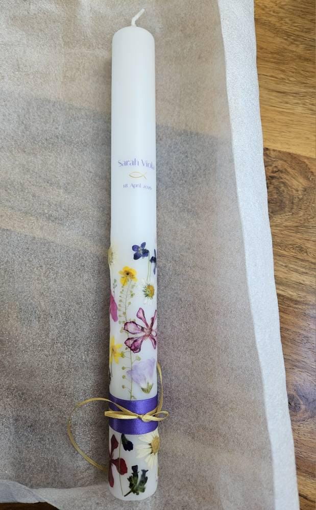 This modern christening and communion candle with real wildflowers and blossoms is available in sizes 40 × 4 cm / 40 × 5 cm / 25 × 7 cm and is made individually for you.